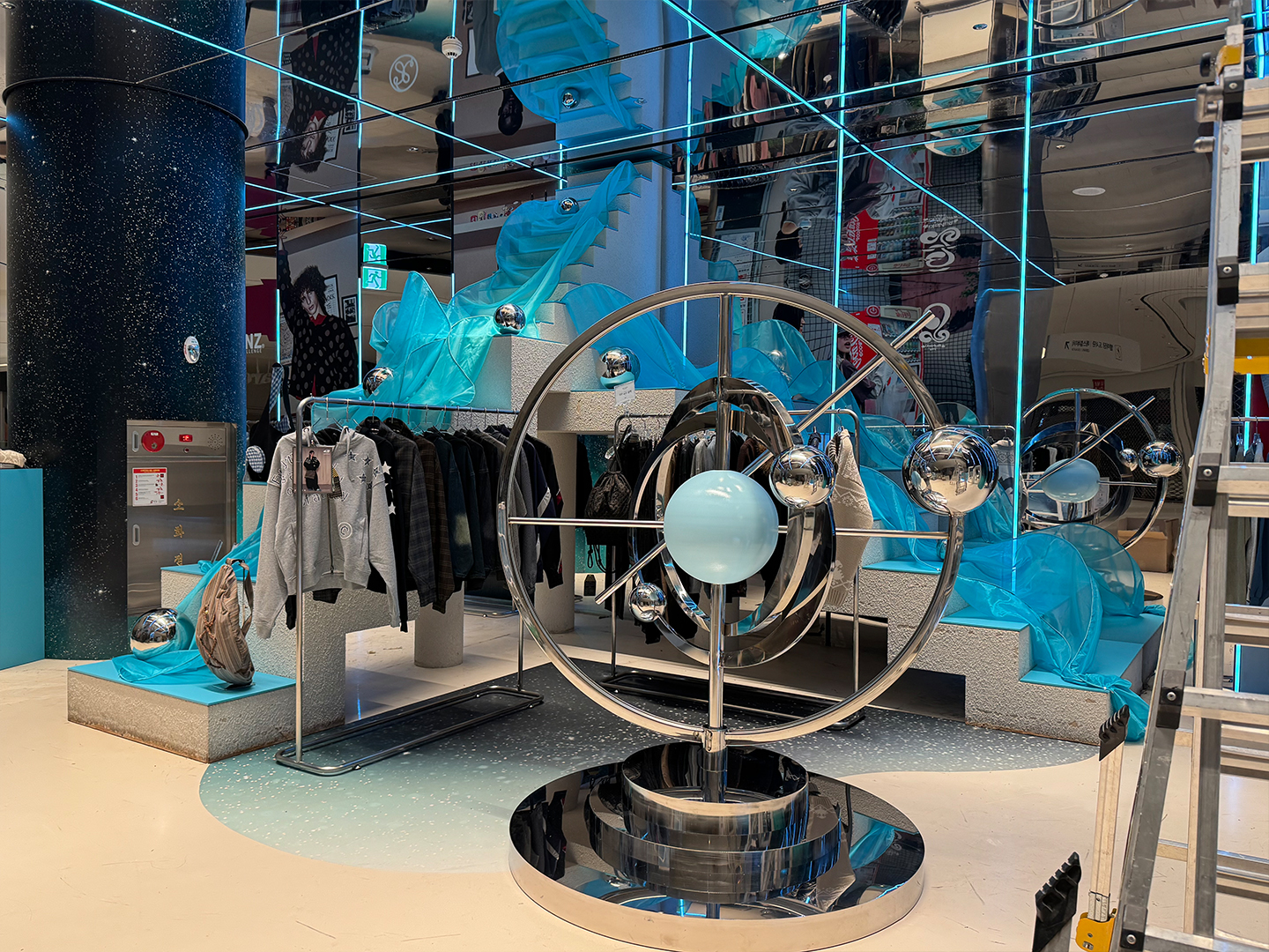 수원 스타필드 4층에서 진행한 폴릭스 팝업스토어를 위한 입구쪽 메인 집기, 기둥감싸는 반원 집기, 하단 조명이 설치된 매대를 제작하였습니다. 입구의 메인 집기는 원형단상 위에 은경아크릴을 배치하고 단상을 감싸는 모양의 호 모양의 매대 2개를 제작 후 그 위에 메탈조형물을 설치해주었습니다. 내부에 들어가는 반원 집기는 기둥을 감싸는 계단형식으로 제작하였습니다. 탈의실 옆에 들어가는 매대의 경우는 하단 조명도 설치하였습니다. 또한 원형기둥, 벽면 시트, 바닥 시트도 시공하였습니다. 모든 집기들은 MDF 합판으로 제작 후 페인트로 마감하였습니다.