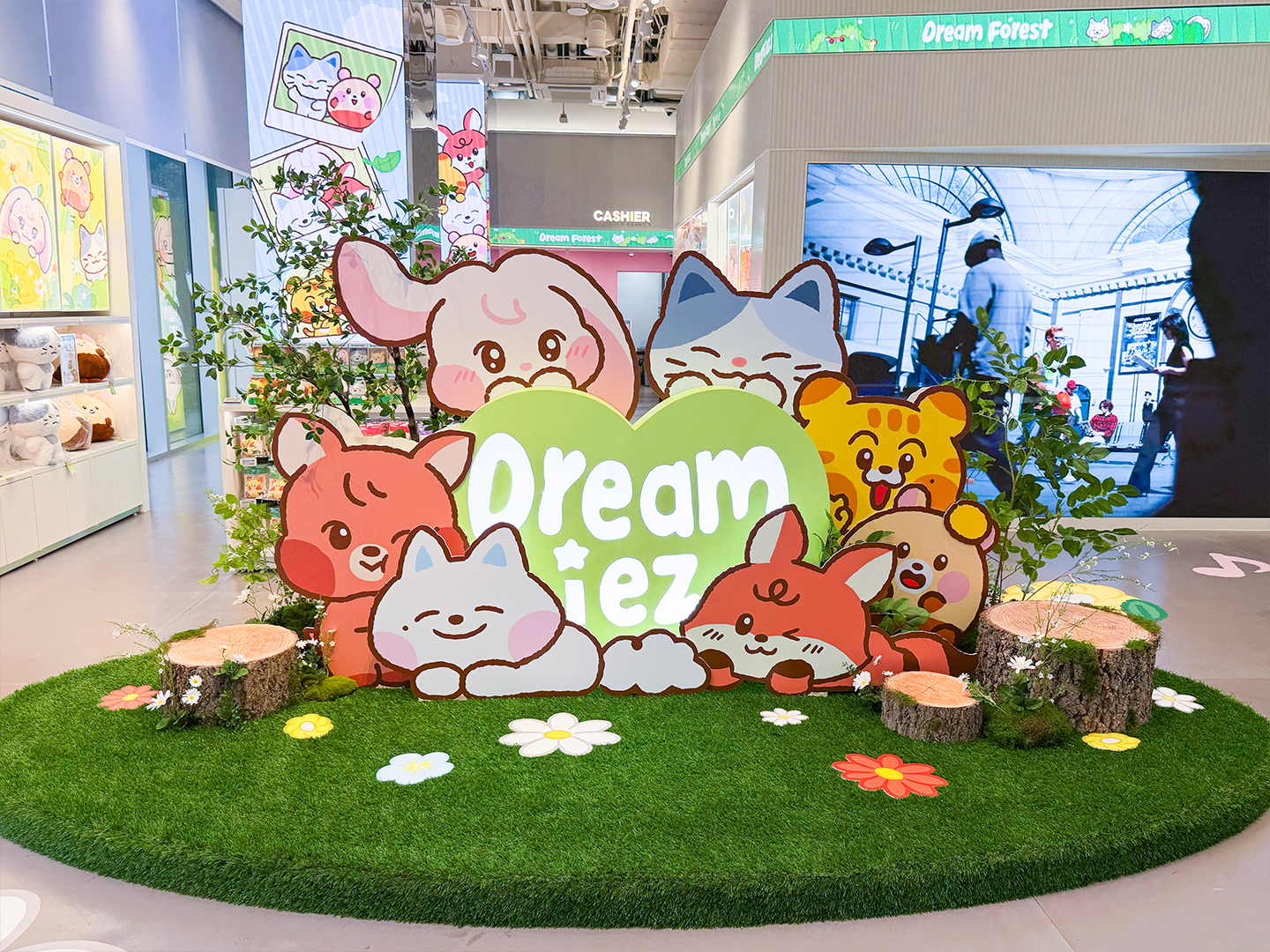 홍대 케이팝 스퀘어에서 진행한 NCT DREAM의 DREAMIEZ 팝업스토어의 집기 제작 및 시공하였습니다. 드리미즈의 드림숲과 같은 컨셉을 위주로 집기를 제작하였습니다. 버섯집 모양의 집기와 통나무 의자가 배치되어있는 드리미즈 단상, 제품 디스플레이 매대를 제작하였습니다. 버섯집 모양의 집기와 단상 위의 드리미즈 LED간판에는 NCT DREAM의 멤버의 7마리 동물 캐릭터 포맥스를 설치하였습니다. 현장에 설치된 단상은 드림숲 컨셉에 맞춰 잔디 카페트를 설치하였습니다. 제작한 모든 집기는 MDF 합판, 각재, 연질합판으로 제작 후 페인트와 실사출력 시트지로 마감하였습니다.