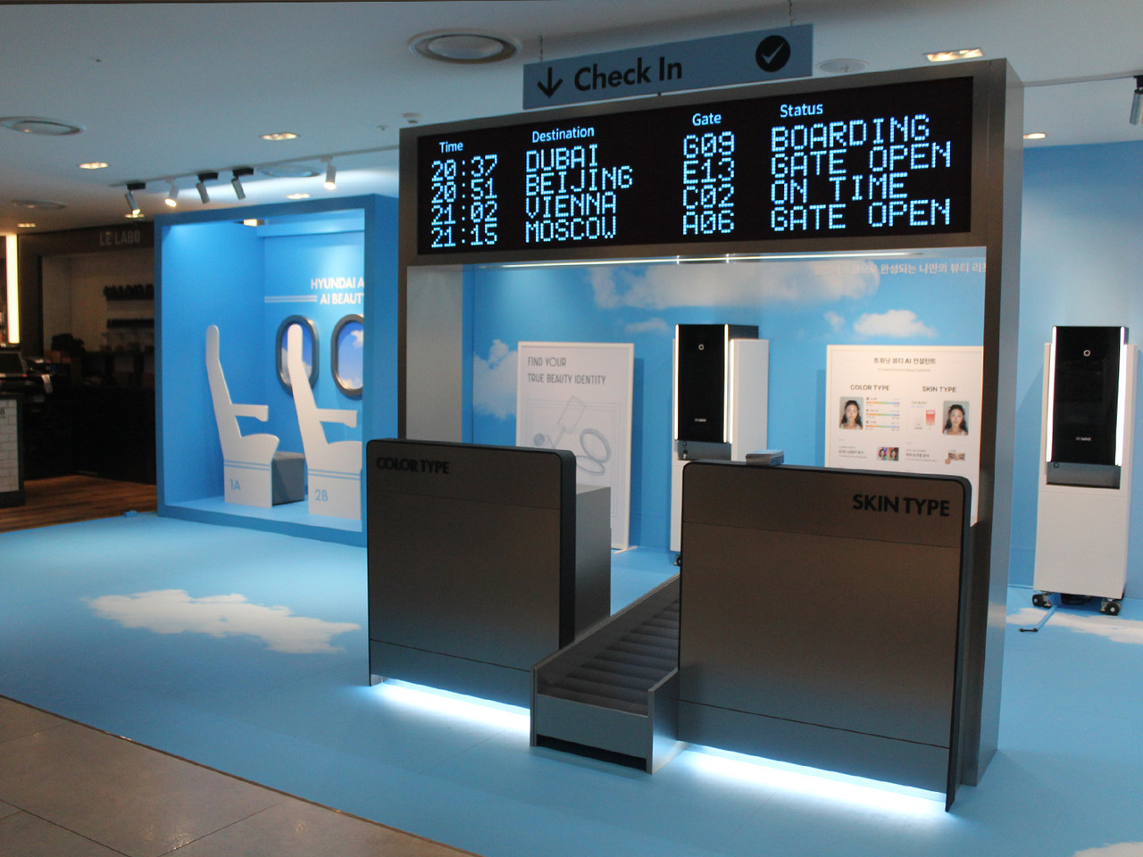 현대무역센터 면세점에서 진행한 트위닛 AI 뷰티트립 체험 공간을 위한 집기를 제작하였습니다. 뷰티 트립이라는 컨셉에 맞는 여행테마로 메인 집기인 비행기 시간표가 있는 전광판과 하단 체크인 카운터 형대의 매대, 좌측에는 비행기 내부 의자와 창문이 있는 포토존 등 AI 뷰티 트립이라는 느낌에 집중한 집기들을 제작 및 설치하였습니다. 모든집기는 MDF 합판으로 제작 후 실사출력 시트지와 인테리어 필름으로 마감하였습니다.
